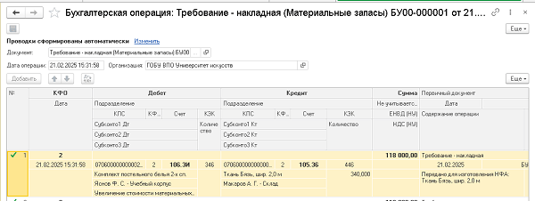 - «Типовая операция» – для этого примера из справочника выбирается «Передача для изготовления нефинансовых активов (106.00, 109.00)»;