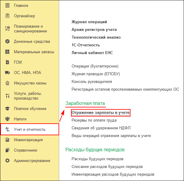 2.1. Для формирования бухгалтерских записей по данным о начислениях по договорам гражданско-правового характера и начисленных страховых взносах предназначен документ «Отражение зарплаты в учете» раздела «Учет и отчетность» (рисунок 5). Документ можно заполнять вручную или автоматически с помощью загрузки данных из иной программы, которая используется для расчета заработной платы. Рассмотрим на примере ручного заполнения документа.