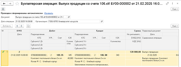 3.5. После проведения документа «Выпуск продукции со счета 106.хИ» можно просмотреть сформированные проводки (рисунок 11) и сформировать «Бухгалтерскую справку (ф.0504833)».