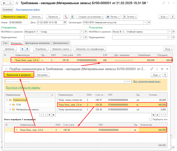 - в группе реквизите «Получатель» – ответственное лицо и подразделение, принимающие материалы.
