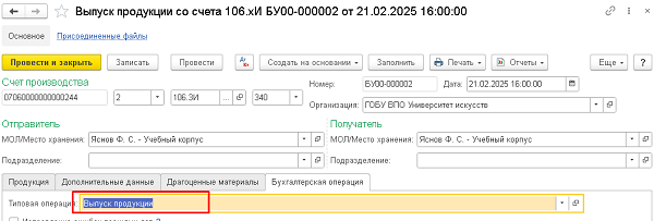 3.4. На закладке «Бухгалтерская операция» доступен единственный вид типовой операции – «Выпуск продукции» (рисунок 10).