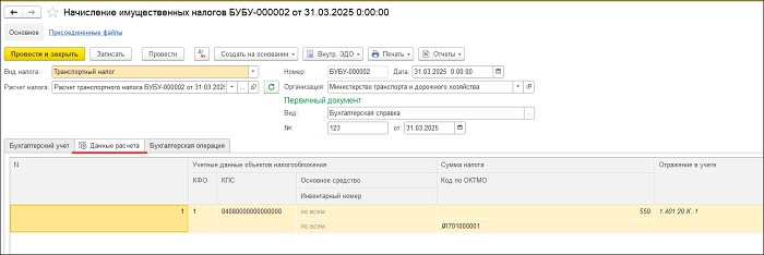 2.1. На основании документа «Расчет транспортного налога» вводится документ «Начисление имущественных налогов» (рисунок 4).
