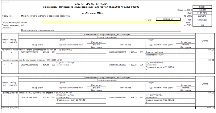 На балансе Министерства транспорта и дорожного хозяйства (г. Барнаул) для управленческих нужд числится легковой автомобиль Nissan Tiida 1.6 AT с мощностью двигателя 110 л. с. Автомобиль зарегистрирован в ГИБДД г. Барнаула. Согласно Закону Алтайского края от 10.10.2002 № 66-ЗС "О транспортном налоге на территории Алтайского края", налоговая ставка для этой категории транспортных средств составляет 20 руб. за 1 л. с. Согласно учетной политике, налоговые обязательства принимаются в периоде, по которому рассчитано обязательство (в отчетном периоде). Обязательство по налогу на имущество принято, как событие после отчетной даты (31.03.2025). Сумма исчисленного транспортного налога за I квартал 2025 г.: 550 руб. (110 л. с.× 20 руб. / 4). Авансовые платежи уплачиваются не позднее 28-го числа месяца, следующего за истекшим отчетным периодом. В апреле учреждение уплатило сумму задолженности по транспортному налогу.