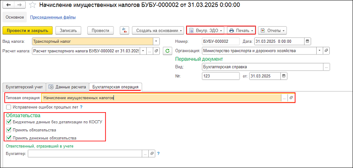 2.5. После проведения документа «Начисление имущественных налогов» по кнопке «Печать» или «Внутр.ЭДО» (рисунок 7) также можно распечатать или сформировать «Бухгалтерскую справку по ф. 0504833» (рисунок 8).