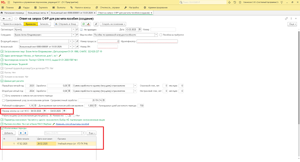 Изменения также касаются и автоматического заполнения «Ответа на запрос СФР». Период, за который назначается пособие с 01.03.2025 по 03.03.2025, полностью состоит из дней, которые оплачивает работодатель. При вводе документа ответ на запрос будет автоматически устанавливать флажок «Пособие не требуется». Также будет заполнена причина отказа от выплаты пособия с описанием периодов исключения и оплаты за счет работодателя.