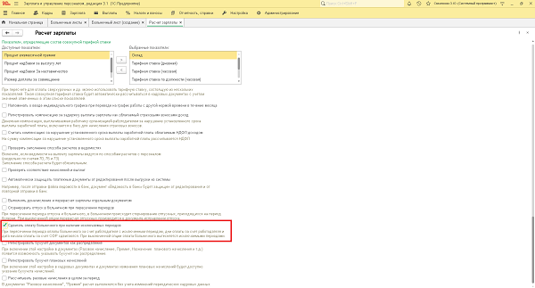 Для этого в настройках расчета зарплаты необходимо поставить флажок «Сдвигать оплату больничного при наличии исключаемых периодов».