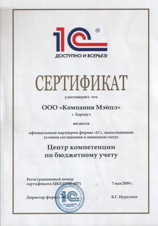 Компания Мэйпл получила первый в Алтайском крае статус Центра компетенции по бюджетному учету от фирмы 1С – как подтверждение высокой квалификации сотрудников Компании Мэйпл в области автоматизации бухгалтерского бюджетного учета.