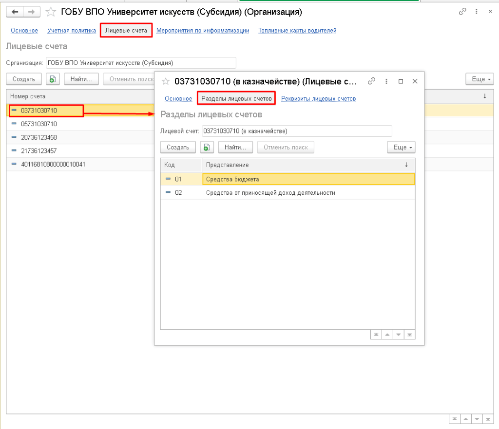 Если при создании кассовых документов не получается выбрать код вида финансового обеспечения и источник средств, тогда необходимо проверить настройки лицевого счета. Для этого зайдем в карточку организации - раздел Лицевые счета. Выберем необходимый счет и перейдем в Разделы лицевых счетов.
