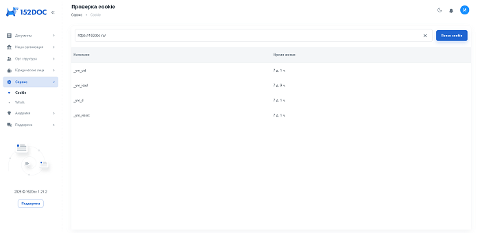 С помощью Раздела «Сервис» можно проверить cookie, используемые на сайте, и посмотреть информацию по введенному домену.