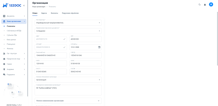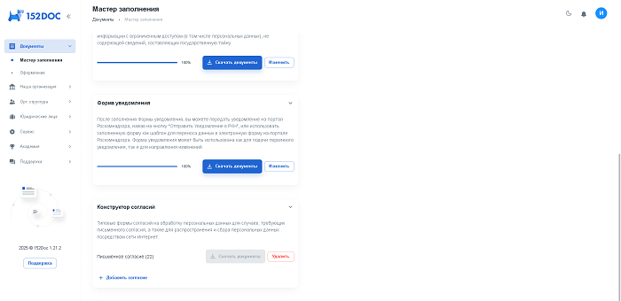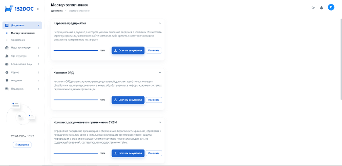 152DOC – это комплексное решение, которое поможет вам на каждом этапе: от создания необходимых организационно-распорядительных документов (ОРД) и документов по применению средств криптографической защиты информации (СКЗИ) до формирования уведомлений для Роскомнадзора. Сервис позволяет сэкономить время и минимизировать вероятность ошибок благодаря автоматической подгрузке данных из ЕГРЮЛ и пошаговому заполнению шаблонов.