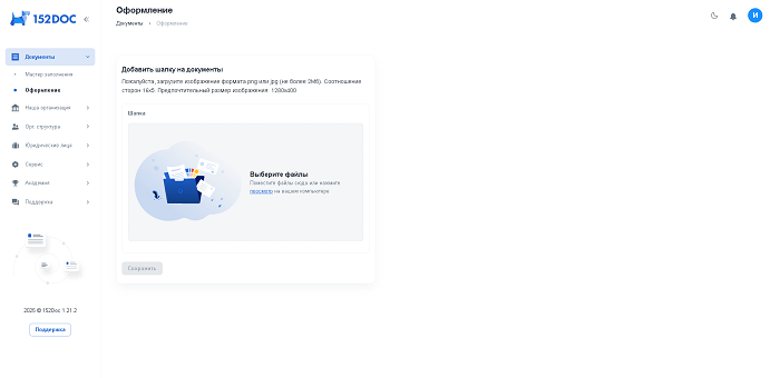 Раздел «Документы, оформление» позволяет загрузить изображение, которое будет находится в «шапке» документов.