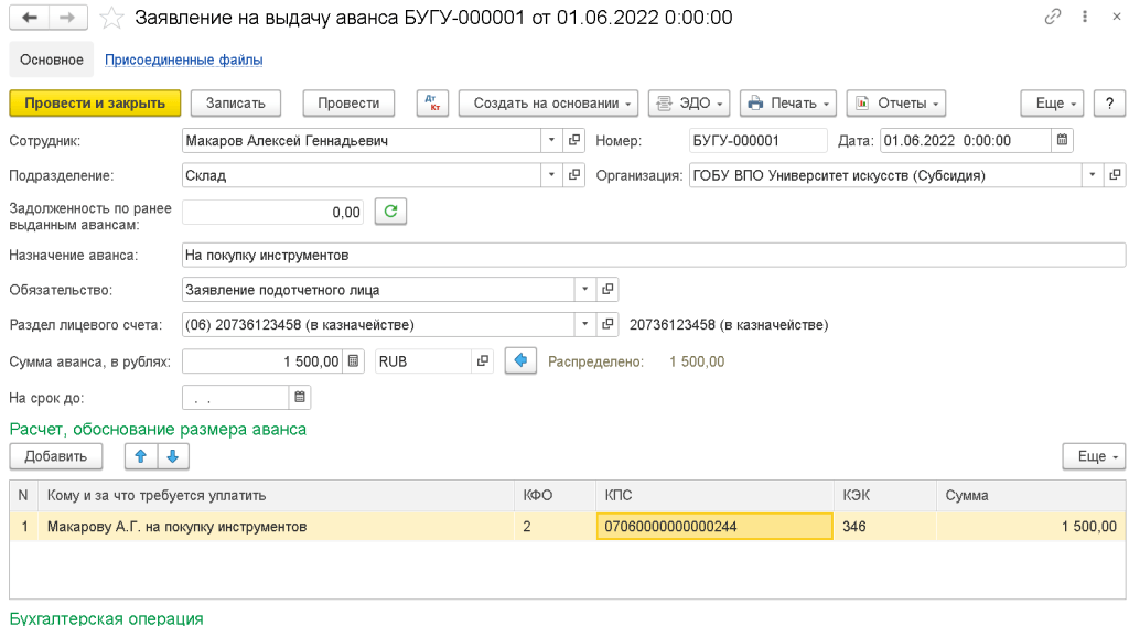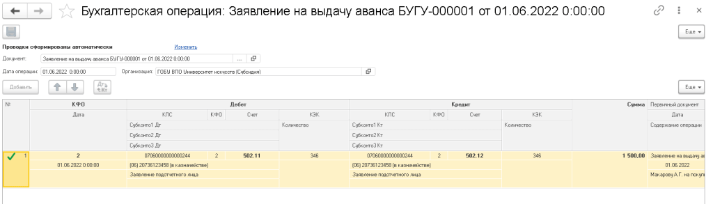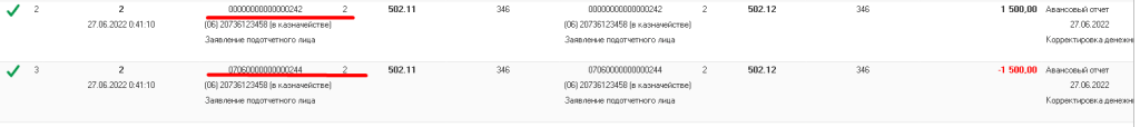 ПРИМЕЧАНИЕ: Если после проведения авансового отчета, у вас происходит перерасчет денежных обязательства, то проверьте, сходятся ли у вас КПС, КФО и ИФО (при наличии) в Заявлении на выдачу аванса и Авансовом отчете.