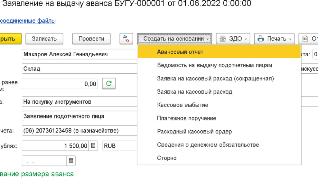 На основании Заявления можно сформировать Заявку на кассовый расход, и прочие кассовые документы, а также сам Авансовый отчет.