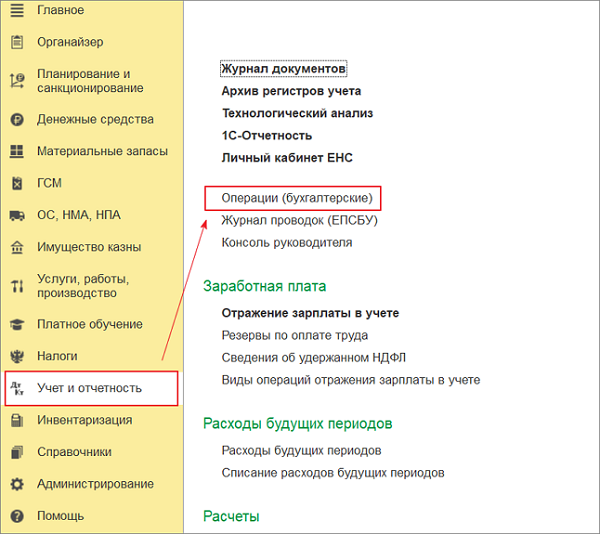 1.1. Для отражения в учете банковской гарантии формируется универсальный документ «Операции (бухгалтерские)» в разделе «Учет и отчетность» - «Операции (бухгалтерские)».