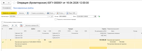 - Субконто 2 Дт: вид обеспечения «Банковская гарантия» выбирается из справочника «Виды обеспечения»;