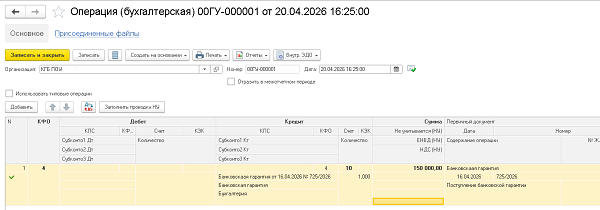 Документ «Операция (бухгалтерская)» формируется так же, как и при получении банковской гарантии, за исключением того, что забалансовый счет 10 и его аналитика указываются в графе «Кредит».