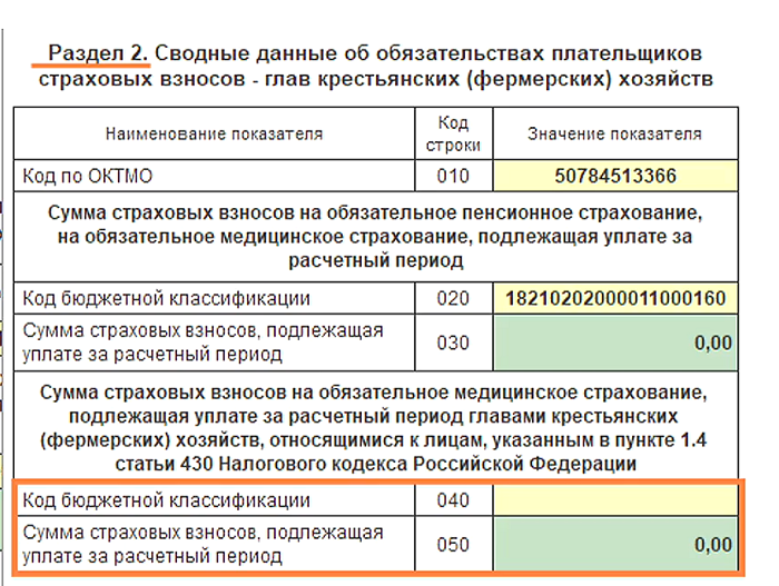 8. Главы фермерских хозяйств в целях расчёта и уплаты страховых взносов относятся к индивидуальным предпринимателям. А это значит, что они имеют право не платить за себя взносы за отдельные периоды, которые определены налоговым кодексом. А также не платить за себя страховые взносы на пенсионное страхование, если они являются военными пенсионерами. В связи с этим в раздел 2 и в подраздел 1 раздела 2 внесены изменения. В разделе 2 добавилась новая строка 050. Она заполняется в том случае, если глава КФХ является военным пенсионером. В этой новой строке 050 он обязан отражать только сумму на ОМС, которая подлежит уплате.