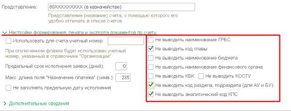 2. «Настройки формирования, печати и экспорта документов по счету»;