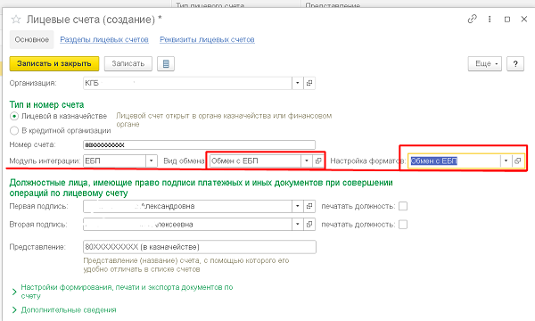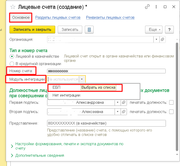 При указании «Модуля интеграции ЕБП» следующие реквизиты лицевого счета устанавливаются автоматически:
