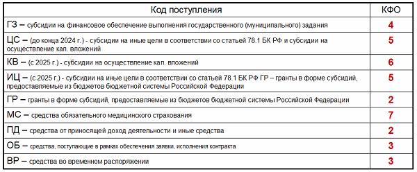 Код поступления ЕБП определяет код финансового обеспечения (КФО) средств, которые будут отражаться на этом разделе лицевого счета.