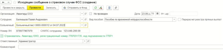 Для чего используется документ «Исходящее сообщение о страховом случае ФСС» и как его создать в программе?