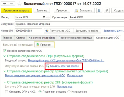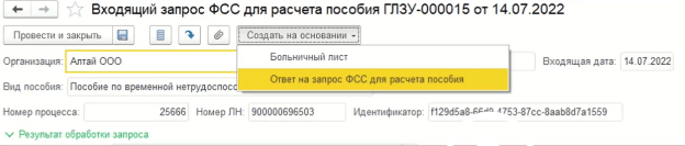 - создать на основании из входящего запроса ФСС для расчета пособий;