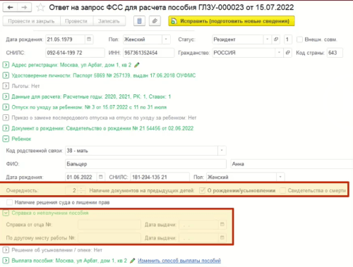 - Создать «Ответ на входящий ответ от ФСС» (Обязательно заполнить справку о неполучении пособия вторым родителем и заполнить при наличии информацию на предыдущих детей).