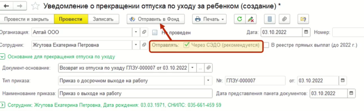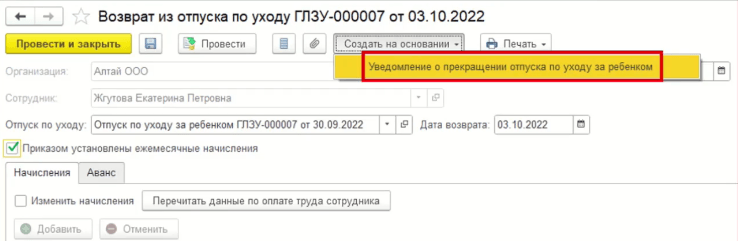 В случае досрочного возврата по уходу за ребенком нужно создать документ «Возврат из отпуска по уходу». Если сотрудник возвращается на работу до исполнения ребенку 1,5 лет, то нужно уведомить ФСС о том, что нужно прекратить платить пособие.