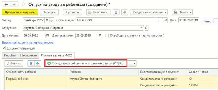 - Нужно создать документ «Отпуск по уходу за ребенком» и заполнить все сведения о ребенке;