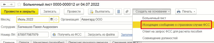 - из документа «Больничный лист», нажав на кнопку «Создать на основании» и выбрать «исходящее сообщение о страховом случае ФСС»;