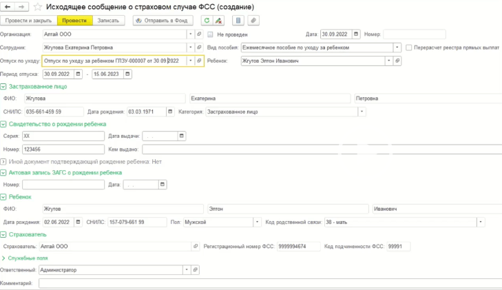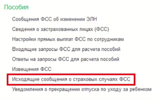 - создать в разделе «Кадры», группа «Пособия» в журнале «Исходящие сообщения о страховых случаях ФСС».
