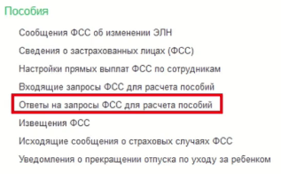 - из рабочего стола в разделе «кадры», нажав на пункт «Ответы на запросы ФСС для расчета пособий».