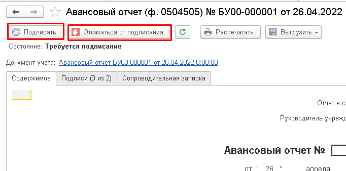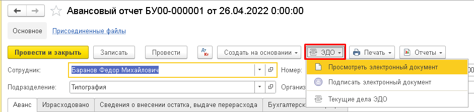 В результате получаем подписанную печатную форму, которая будет являться внутренним электронным документом. Чтобы проверить его состояние, можно нажать кнопку ЭДО и выбрать в меню команду Просмотреть электронный документ.