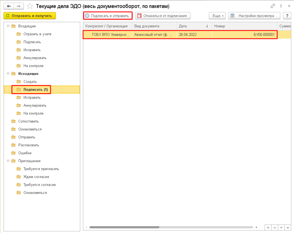 Двойным кликом по строке списка можно просмотреть документ. После проверки документа пользователь может подписать документ командой Подписать или Отказаться от подписания.