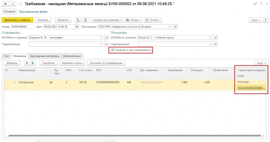 4. При использовании документа «Требование – накладная» так же имеются реквизиты для прослеживаемости.