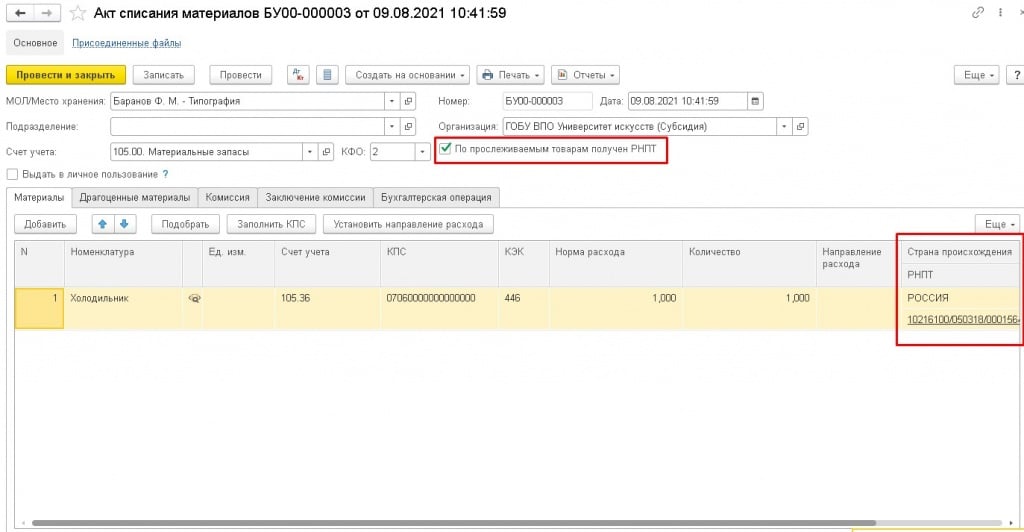 3. В документе «Акт списания материалов» в табличной части так же появились графы для прослеживаемости и реквизит – По прослеживаемым товарам получен РНПТ.