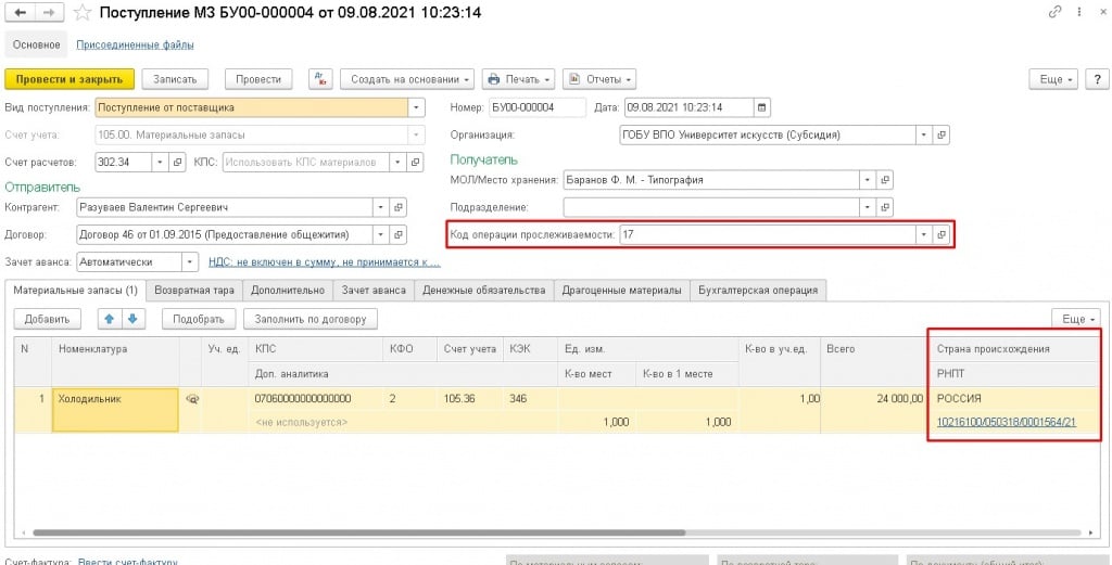 2. В документе «Поступление МЗ», в табличной части Материальные запасы – появились графы «Страна происхождения», которая автоматически берется из карточки номенклатуры и РНПТ (Регистрационный номер партии товара), который присваивает ФНС. Так же реквизит – код прослеживаемости (17 или 21)