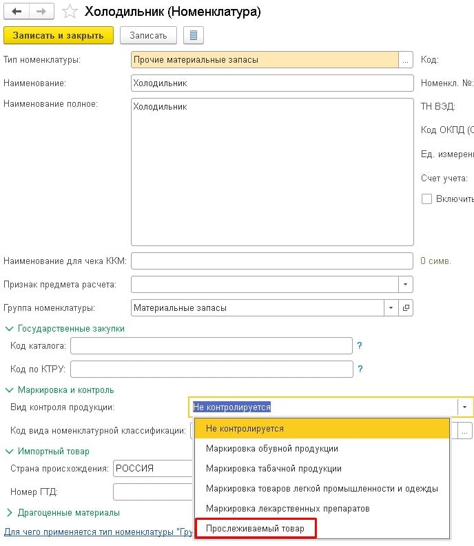 1. В карточке номенклатуры, после настройки параметров учета, в графе «Вид контроля продукции» появился новый реквизит – Прослеживаемый товар