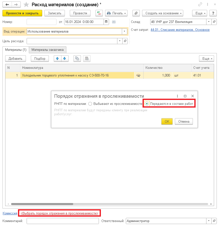 Теперь при выборе материалов, относящихся к прослеживаемым товарам, в нижней части документа появляется гиперссылка «Выбрать порядок отражения прослеживаемости». После перехода по гиперссылке появляется окно для отражения порядка прослеживаемости. При составлении документа по реализации появляется возможность отражать сведения о РНПТ, которые входят в состав выполненных работ.