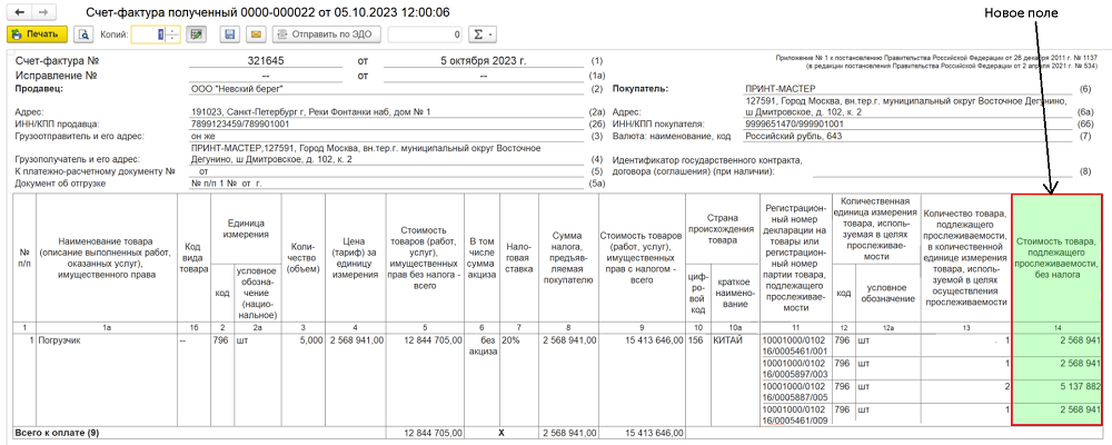 Согласно ст. 169 НК РФ в редакции 389-ФЗ от 31.07.2023 г. в счете-фактуре, если в нем содержатся прослеживаемые товары, должна присутствовать новая графа «Стоимость товара, подлежащего прослеживаемости». Таким образом, помимо основного контроля, отвечающего за количество ввозимого в страну товара, вводится мониторинг стоимости этого товара.