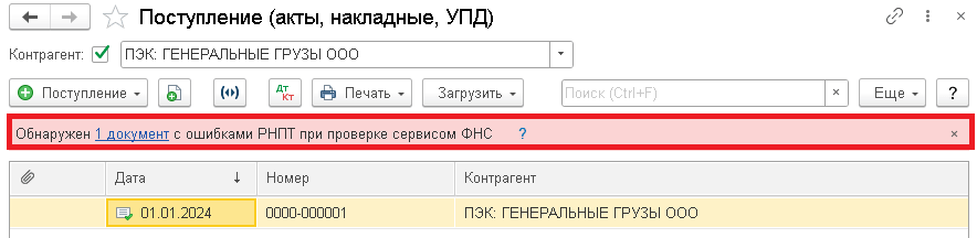 Предупреждение также будет отражаться в журнале «Поступление (акты, накладные, УПД)».
