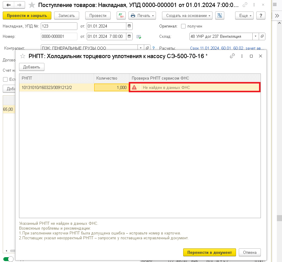 При вводе РНПТ происходит мгновенная проверка сервисом ФНС. Если номер заполнен неправильно, то программа сразу проинформирует об этом: появится ошибка с информацией о причинах возникновения.