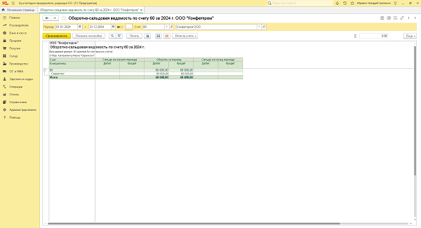 Сформируем оборотно-сальдовую ведомость на текущую дату (рисунок 3) и увидим, что задолженности перед поставщиком нет.