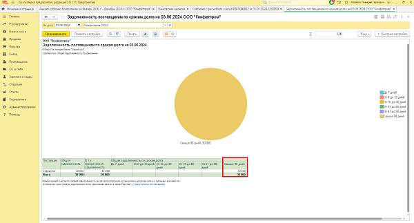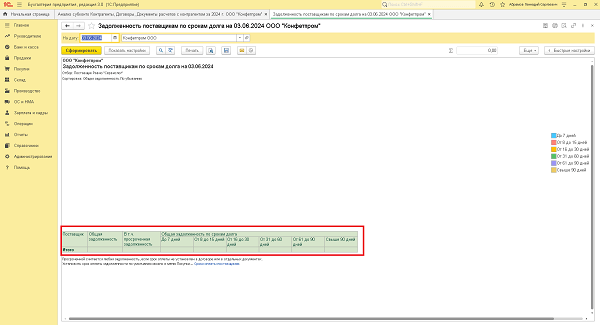 На рисунке 2 видно, что в отчете «Задолженность поставщикам по срокам долга» выходят данные, что перед поставщиком есть задолженность свыше 90 дней.
