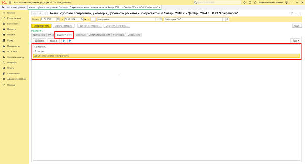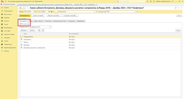 Однако в отчете «Оборотно-сальдовая ведомость» плохо видно развернутое сальдо по контрагентам. Поэтому при возникновении такой ситуации рекомендуем обратить внимание на другой отчет «Анализ субконто» (Отчеты – Стандартные отчеты – Анализ субконто). В данном отчете выберем субконто контрагенты, далее перейдем в настройки отчета по кнопке «Показать настройки». В группировке поставим галочку «по субсчетам», а на закладке «Виды субконто» добавим субконто «Договоры» и «Документы расчетов с контрагентами».
