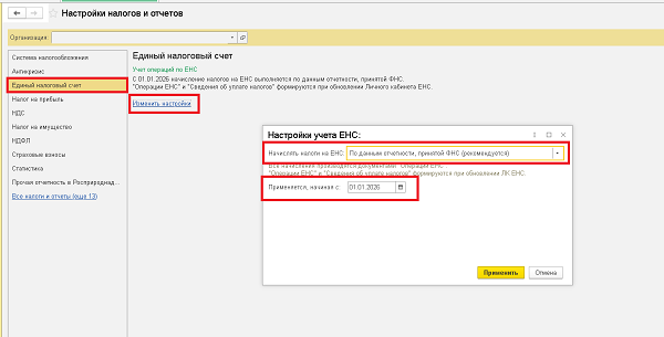 Перейдите в раздел «Главное» — «Налоги и отчеты» — «Единый налоговый счет» — ссылка «Изменить настройки» — в поле «Применяется, начиная с» - укажите дату, с которой нужно применить новую настройку.