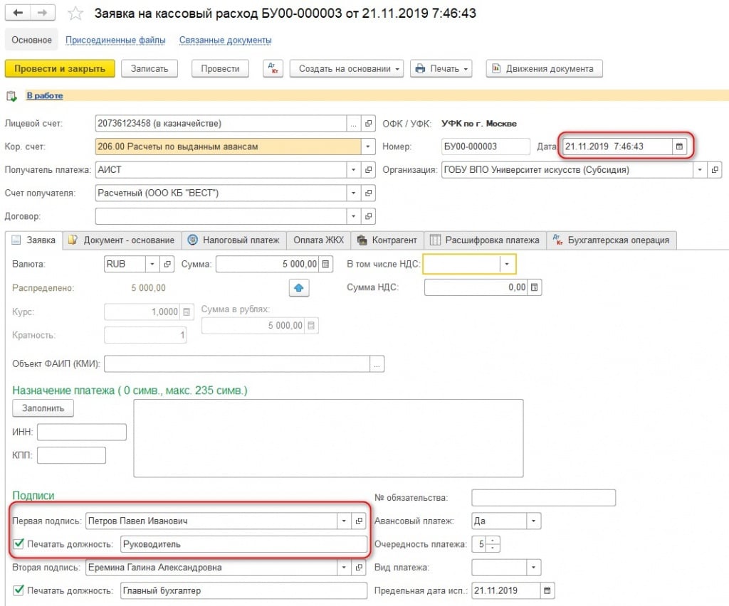 По условиям примера – новый директор приступил к исполнению своих обязанностей с 1 ноября, и это указано в карточке учреждения. Дата создания платежного документа также указана более поздняя.