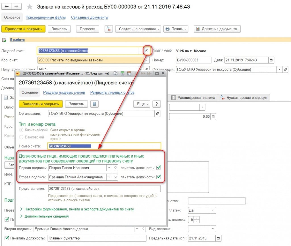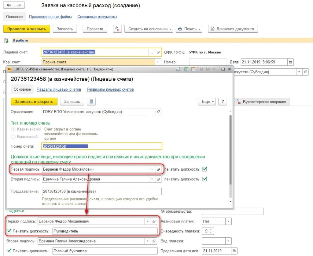 - в настройках лицевого счета указать корректные данные в поле «Первая подпись» блока «Должностные лица, имеющие право подписи».