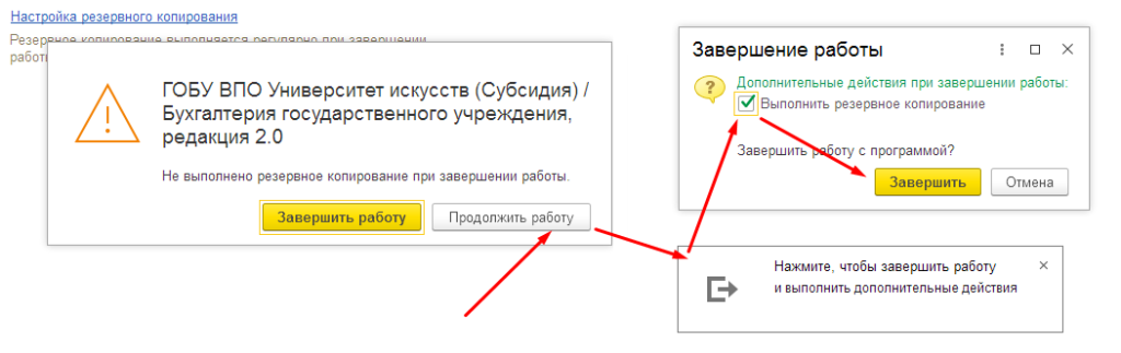 • Опция "При завершении работы". При выборе этого варианта пользователю с правами "Администратор" при завершении работы в программе будет предложено выполнить резервное копирование. Для этого нужно выбрать кнопку "Продолжить", затем нажать на всплывающее сообщение, в правом нижнем углу и в форме "Завершение работы" нажать кнопку "Завершить". По истечении нескольких секунд сообщение будет скрыто, а в правом верхнем углу программы появляется значок в виде колокольчика. Нажмите его, чтобы открыть форму с сообщением и выполнить дальнейшие действия.