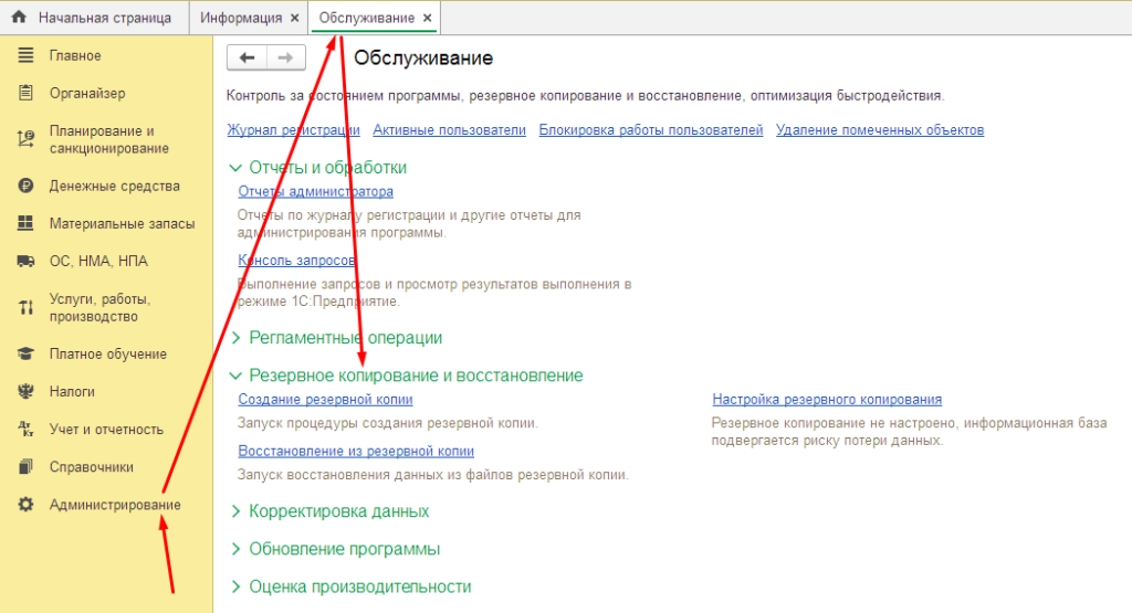 Чтобы перейти в раздел, связанный с резервным копированием и восстановлением, выберите: Администрирование - Обслуживание - Резервное копирование и восстановление.